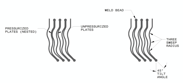 Figure 2: Three-sweep design optimizes stress distribution, thus increasing resistance to fatigue fracture. The tilted bellows axis distributes bending stresses away from the welds and through the sweep radius.